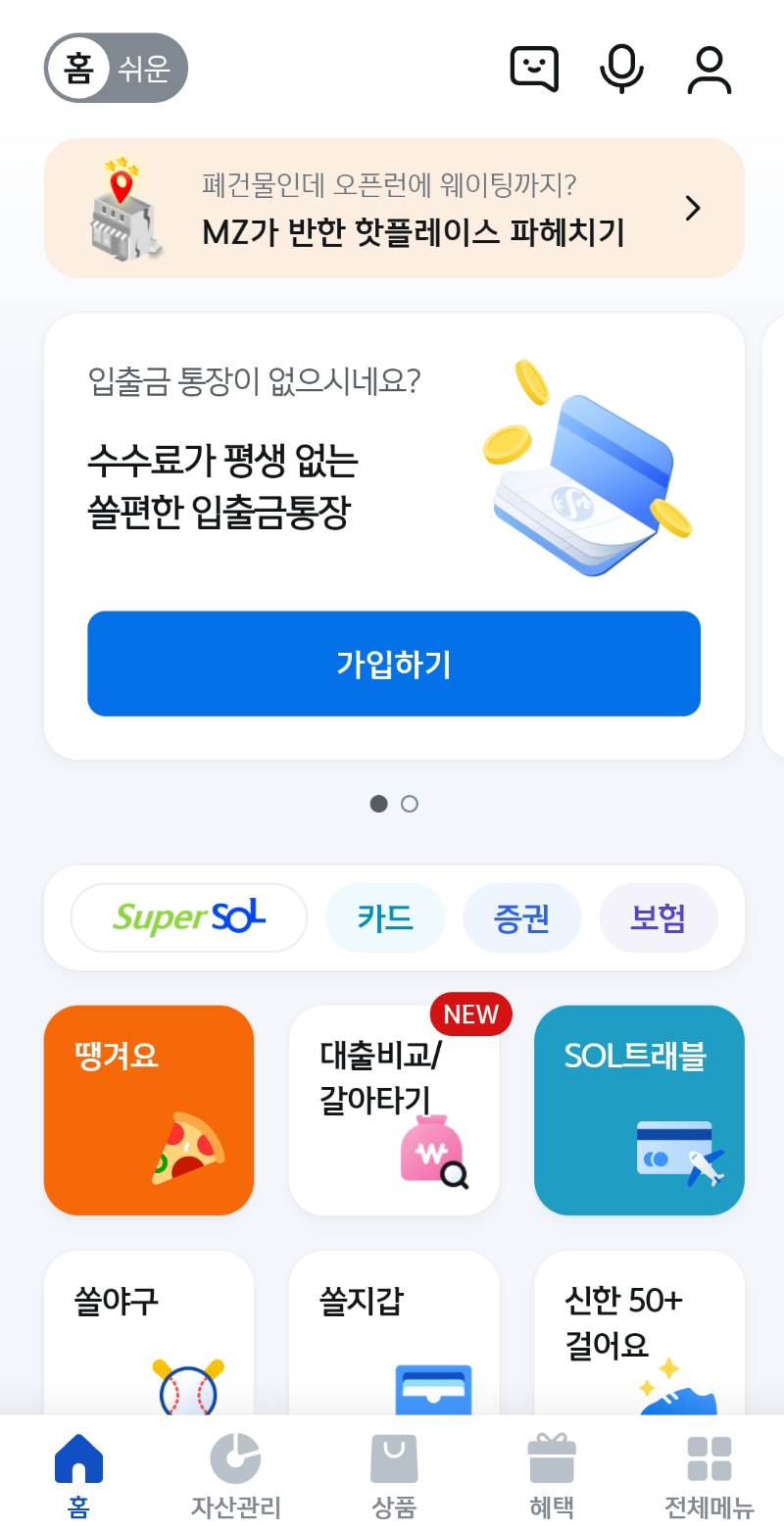 먼저 "신한 Sol Bank" 앱으로 접속해 줍니다! 신한은행 앱으로 접속하면되는데요~ 접속하지마자 보이는 "SOL트래블"을 눌러주면 다음 단계로 넘어갈 수 있습니다!